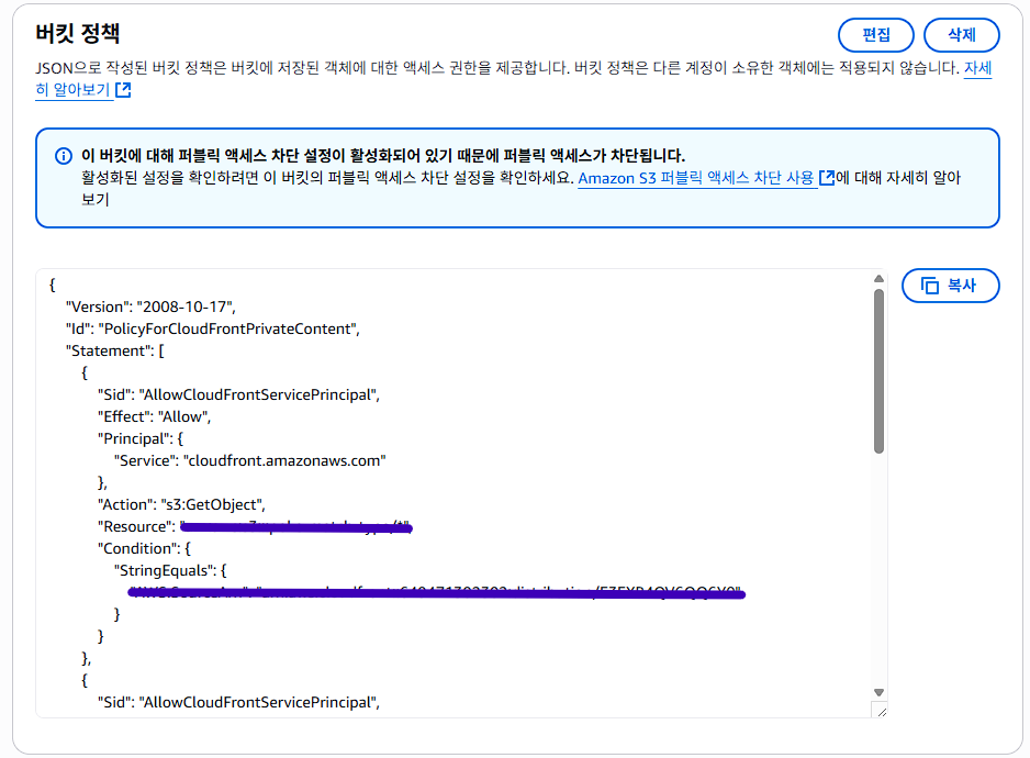 - S3 버킷 ⇒ 권한 탭 ⇒ 버킷 정책을 편집하여, 복사한 CloudFront 정책을 붙여넣는다.