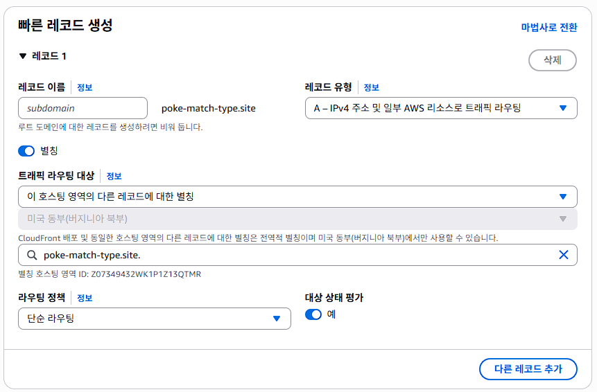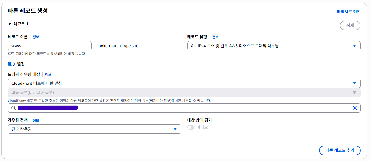 - 루트 도메인 처리를 위해 레코드 이름을 비워두고, 레코드 유형은 A, 별칭에 대한 라우팅으로 배포한 CloudFront 별칭 값을 연결한다.