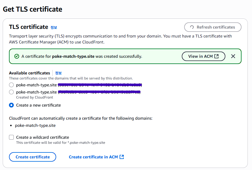 - 만약 Route53 호스팅 영역에 입력한 도메인이 정상적으로 등록되어있다면, Create a new certficate ⇒ Create cerficate 버튼을 통해 현재 페이지에서 바로 인증서를 생성할 수 있다.