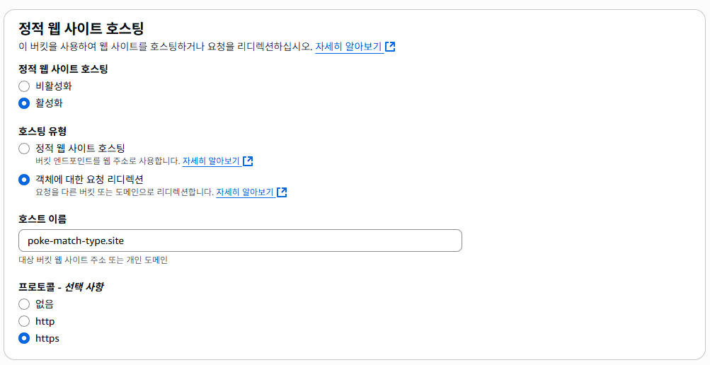 - 버킷 상세페이지에 속성 탭 ⇒ 정적 웹 사이트 호스팅 편집 ⇒ 다음과 같이 호스팅할 도메인을 입력한다.