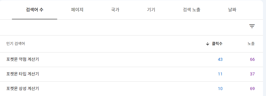 - ‘포켓몬 약점 계산기’ 타이틀을 가지고 있어, 역시 해당 검색어가 노출과 클릭수가 가장 높았고 구글 평균 게재순위 도 최상위였다.