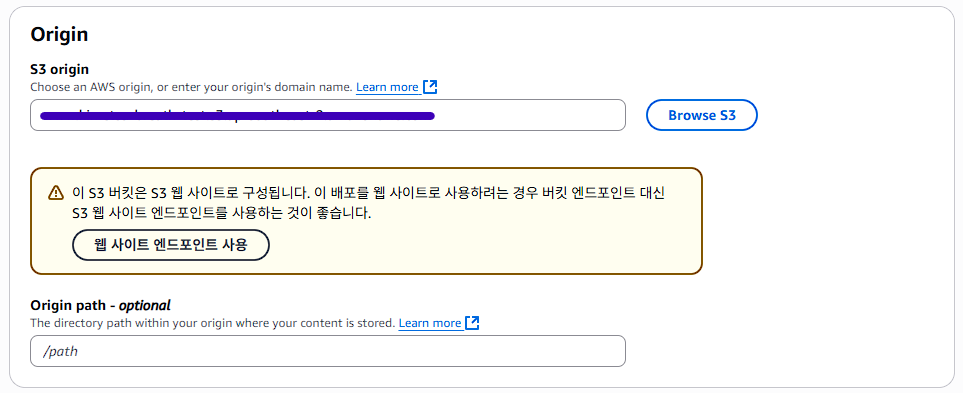 - 리다이렉트 버킷을 오리진으로 하면 정적 웹 사이트 설정때문에 다음같은 경고문이 출력되는데, 웹 사이트 엔드포인트 사용 버튼을 클릭한다