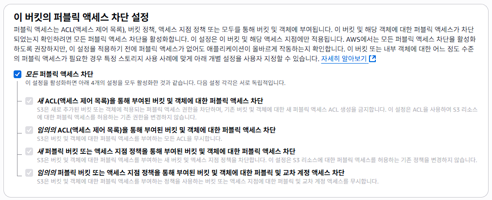 - CloudFront를 통해 버킷에 접근하기에 퍼블릭 액세스는 차단한다.