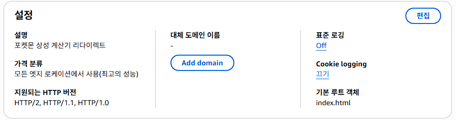 - 다시 CloduFront 배포 페이지의 일반 탭으로 넘어와 Add domain버튼으로 대체 도메인을 연결한다.