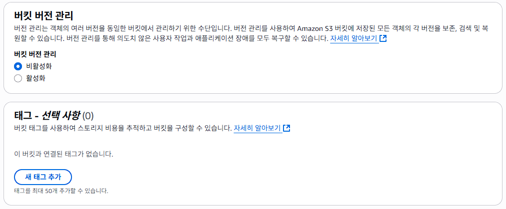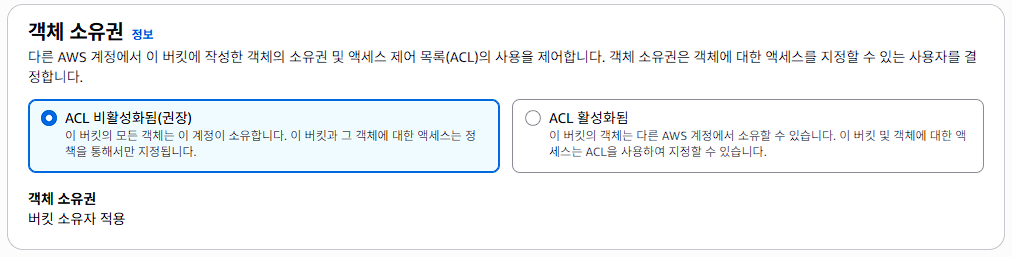 - 버킷을 AWS를 통해서 관리를 할 것이므로 ACL을 비활성화 한다.