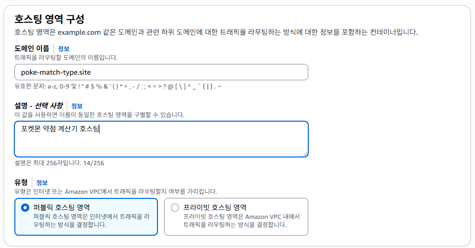 - AWS Route 53에서, 도메인 이름을 입력 후, 호스팅 영역을 생성한다.
