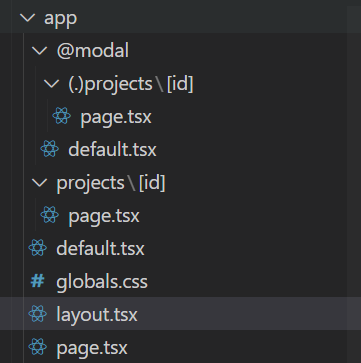 - @modal 슬롯은 루트 레이아웃인 layout.tsx에서 병렬적 라우팅이 되어있기에 (.)projects/id는 기존 페이지와 병렬적으로 출력되어 라우트 모달이 동작한다.
